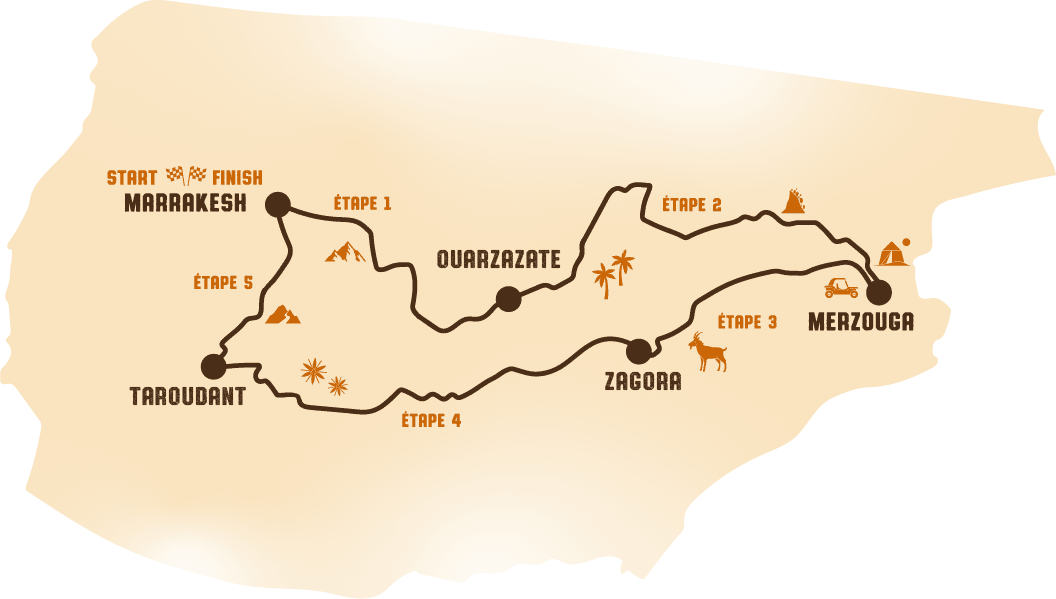 - Le rallye commencera effectivement lundi matin avec une première présentation du véhicule et la procédure d'enregistrement et vendredi soir, nous reviendrons à Marrakech où nous passerons une dernière nuit. Le samedi matin, le Desert Rally sera alors complètement terminé.