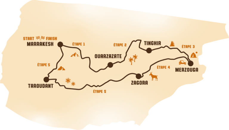 Ton aventure commence par le spectaculaire col du Tizi n'Tichka et les Kasbahs emblématiques de Telouet et Aït Ben Haddou. Le voyage t'emmène via Ouarzazate à travers les oasis verdoyantes de Skoura et les gorges à couper le souffle du Dadès et du Todra.