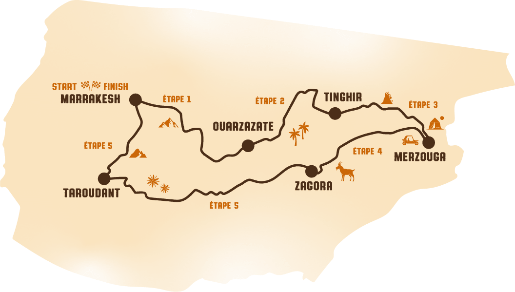 Le point culminant absolu est la nuitée sous les étoiles dans les dunes dorées de l'Erg Chebbi. De retour par les champs de safran de Taliouine, ton voyage inoubliable se termine dans la vibrante ville de Marrakech. Un road trip plein de culture, de nature et de pure aventure.